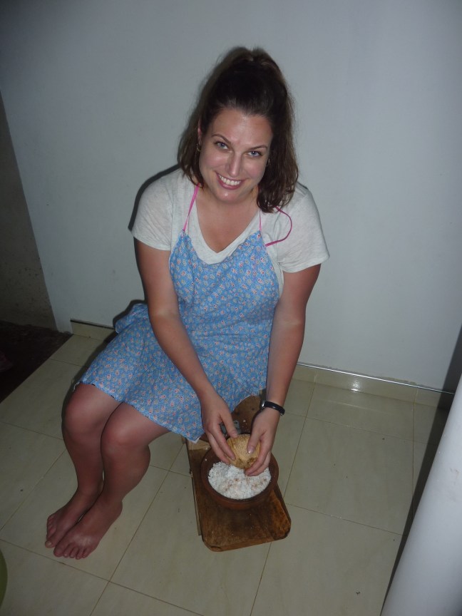 Megan scraping the meat off a coconut. Note the stool she is sitting on in specially made for coconut scraping. The metal scraper is attached to the wooden stool.